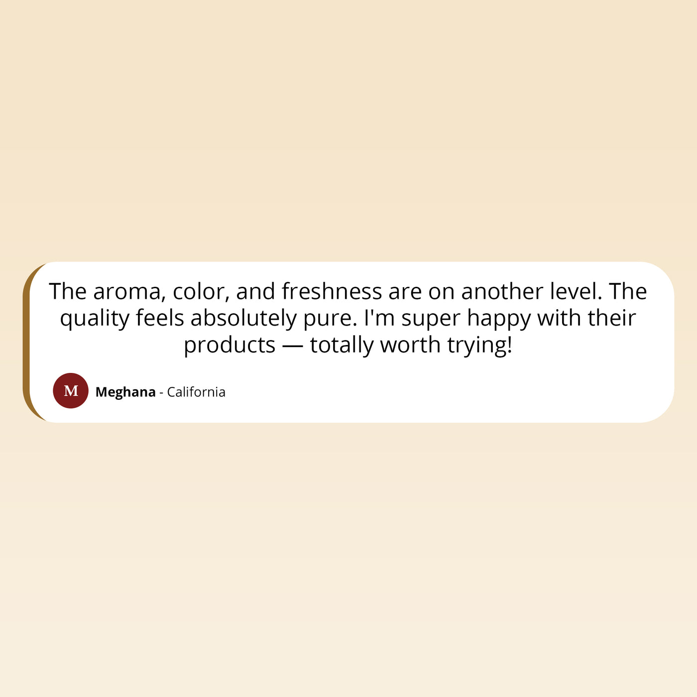 "Super fresh, aromatic, and full of authentic flavour. You can really tell it's pure and homegrown. Highly recommend giving them a try if you love real Indian spices."