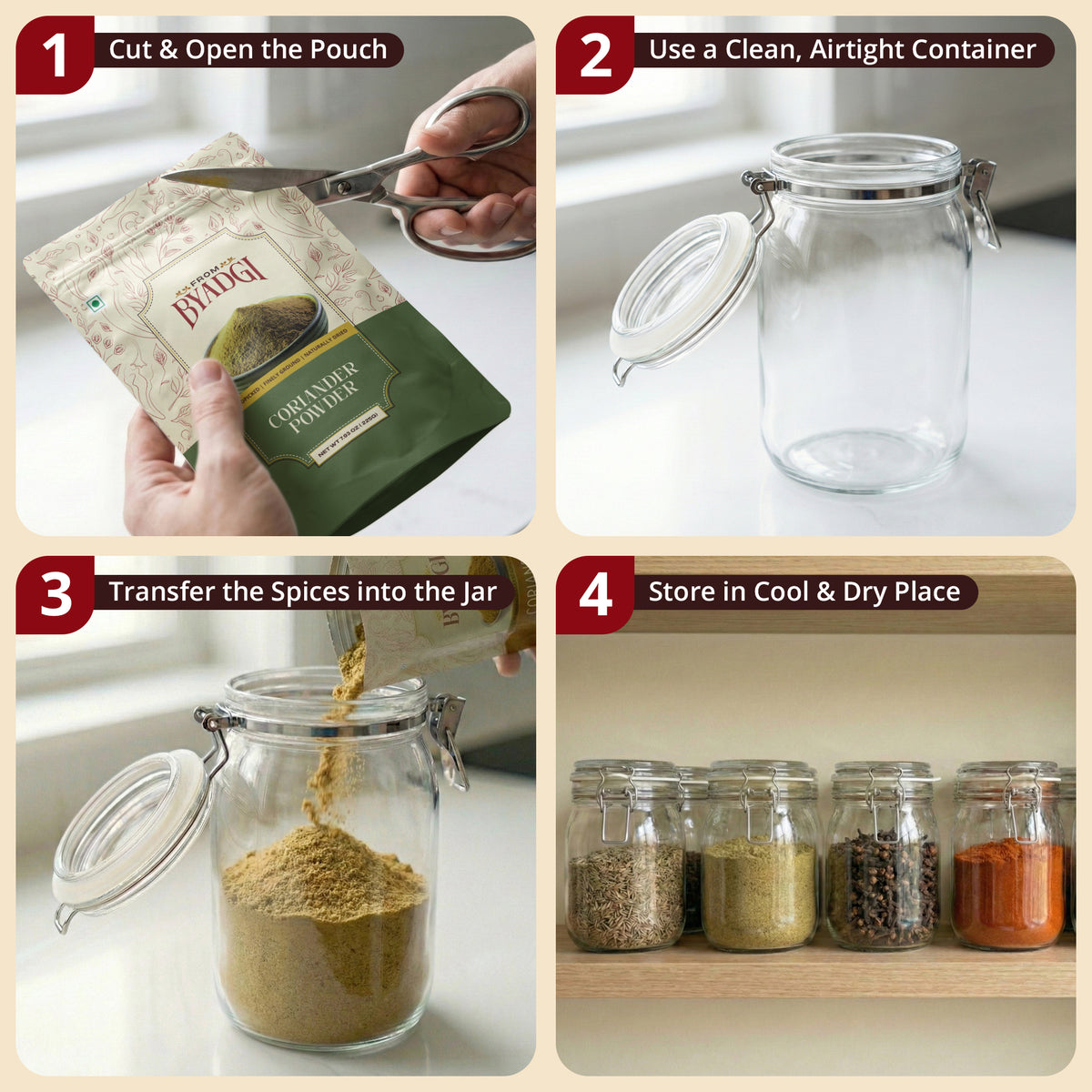Keep in the original sealed pouch or transfer to an airtight container. Store in a cool, dark place — not above your stove. Always use a dry spoon. Stored properly, 18–24 months of freshness. Coriander loses flavor fast when exposed to air and light, so keep it sealed.