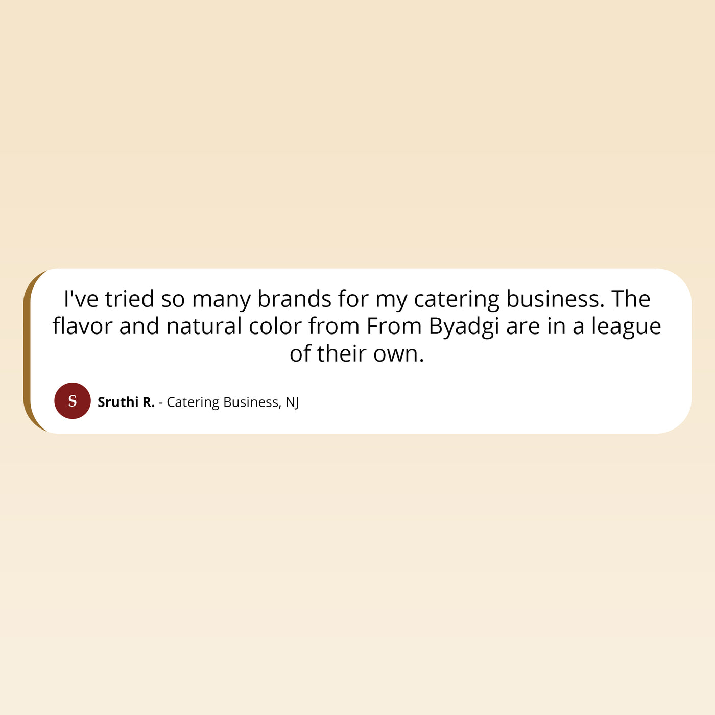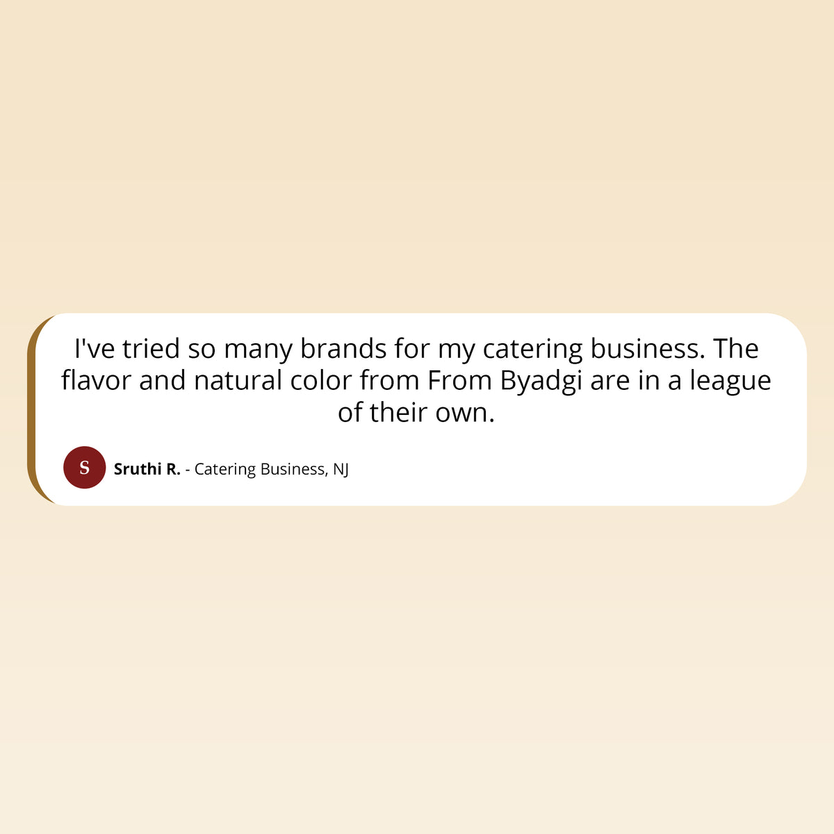"I've tried so many brands for my catering business. The flavor and natural color from From Byadgi are in a league of their own."